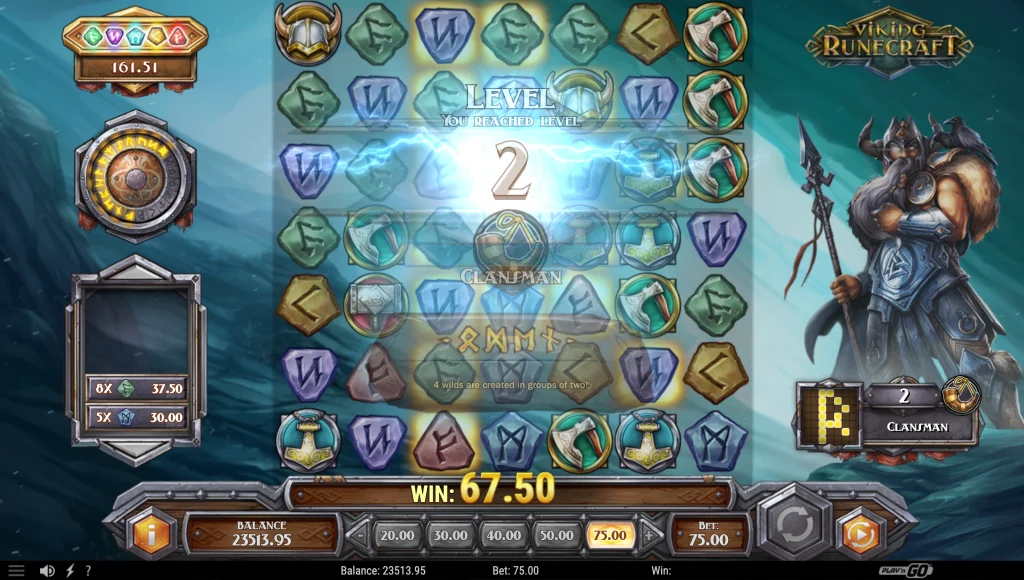 This is where Viking Runecraft shines – bonuses galore. The core is the leveling system: Clear grid patterns to advance through worlds, meeting gods who grant gifts on dud spins. Odin drops paired wilds, Thor zaps in singles, Freya turns symbols wild, Heimdall slashes for clears.